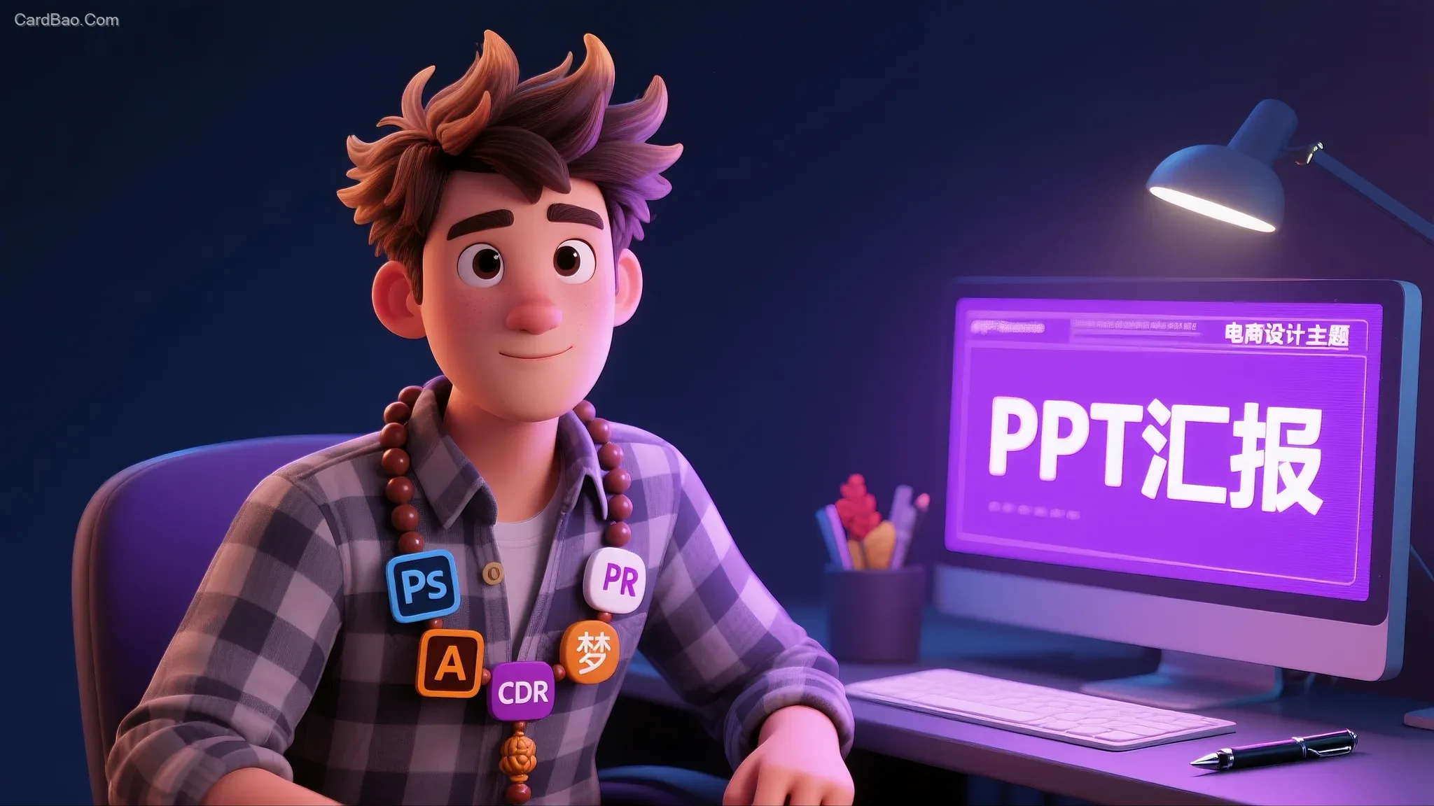 一个鸡窝头年轻男性电商设计师脖子上带着PS图标、PR图标、A图标、即梦图标、CDR图标组成的佛珠,目光看向镜头,旁边放着钢笔,在电脑前加班,紫色屏幕上“PPT汇报”,3D,夸张,逼真,符合客观规律。