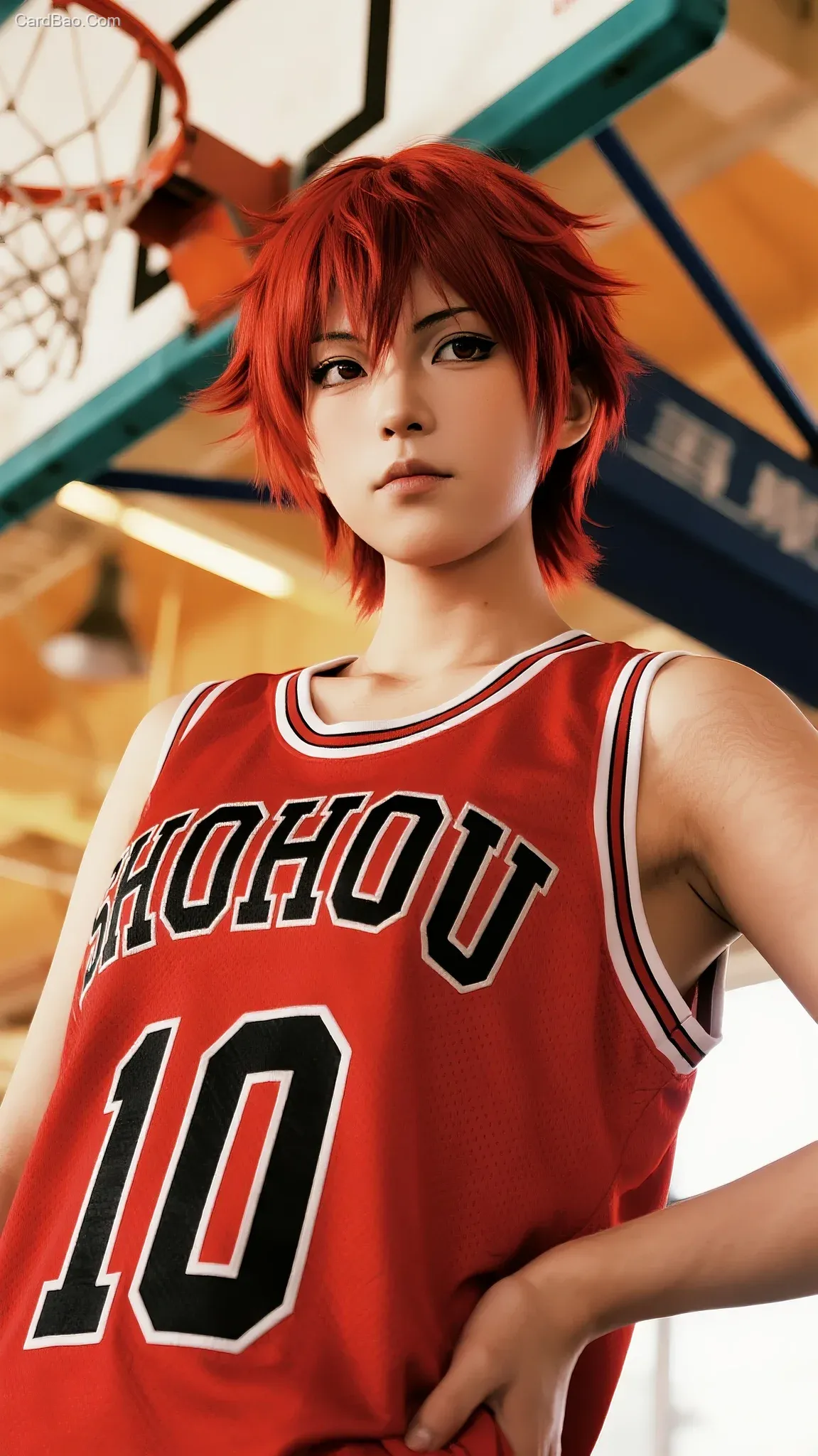 cosplay,真人扮演,仰拍,半身特写,女生扮演樱木花道,红色短发,五官精致,眼神犀利,带着酷酷的表情,身材绝佳,上身丰满,肌肤纹理细腻,穿红色湘北10号球衣,背景是室内篮球馆的篮筐。