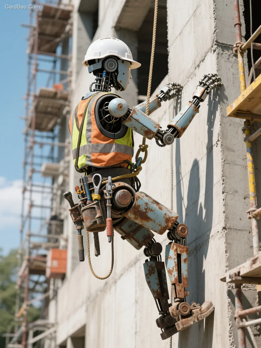 Construction site under the scorching sun, a rusted robot wearing a safety vest and hard hat, secured with a safety harness while working on the exterior of a concrete building. The robot has mechanical arms and legs, with tools hanging from its waist. Scaffolding and other construction equipment are visible in the surroundings. This scene depicts the fusion of technology and construction. Ultra-realistic details. Best output quality. Hyper-realistic, highest resolution, with dynamic camera composition.
