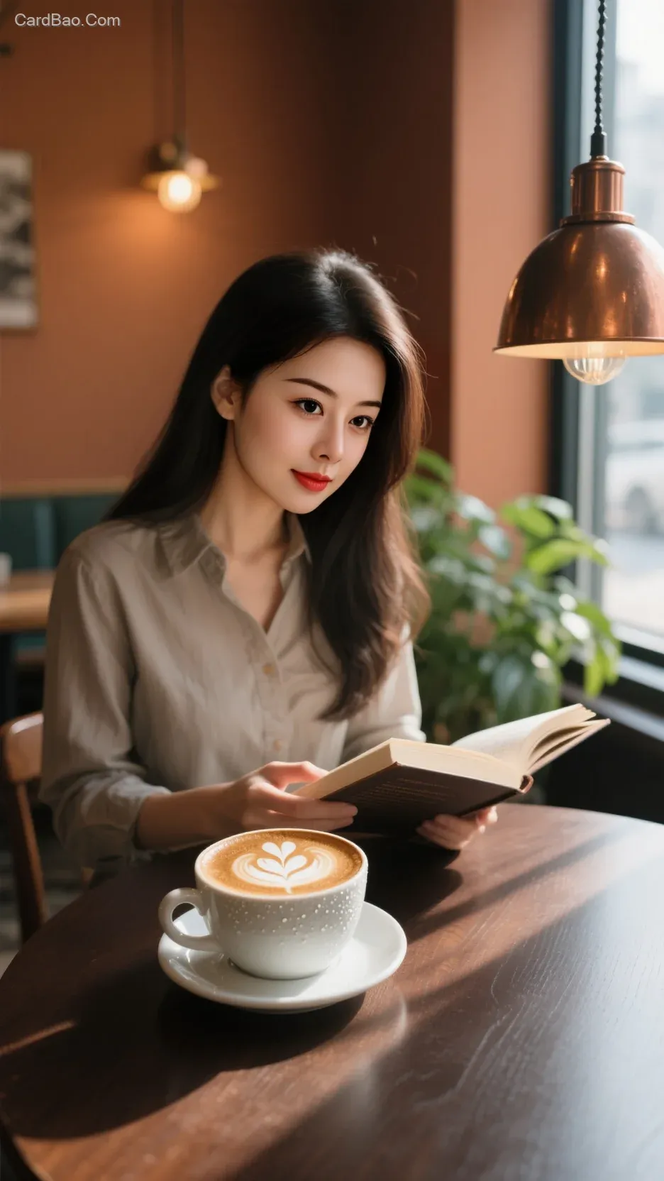 ## A cappuccino with a butterfly latte art that has slightly blurred edges and fine water droplets rests on a dark brown wooden table. Sunlight slants in through floor-to-ceiling windows, casting slender shadows on the table. In the softly blurred background, a long-haired, heavily made-up woman in a shirt is flipping through a book, her fingers lightly touching the corner of a page. A potted plant beside her has a soft outline in the warm light, while caramel-colored walls and a copper pendant lamp complement each other. The scene is set inside a café, captured in a realistic photography style with a medium shot. The atmosphere is cozy and full of life, with soft lighting and warm color tones, perfect for trendy creative works.