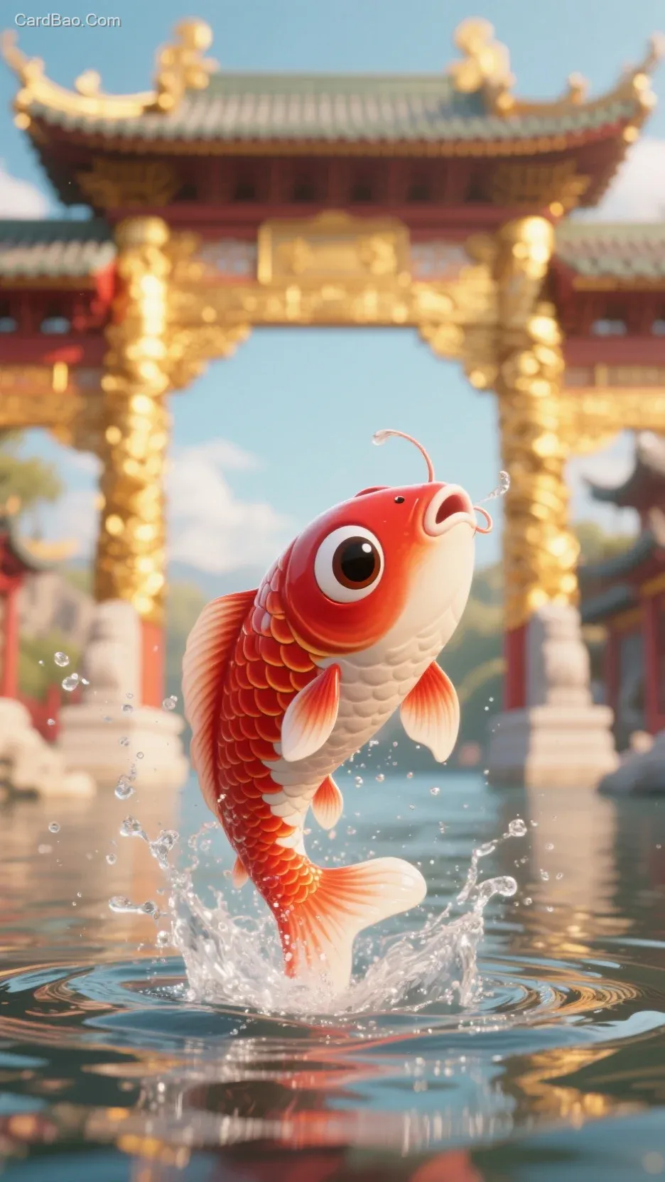 呆萌可爱的大眼睛红色锦鲤高高跃起,后面是金碧辉煌的龙门,超高清,二次元,3D渲染,动漫,柔焦,BK,跃出水面的锦鲤在水面上喷水的姿态,保留水花、涟漪、中式建筑背景和整体风格。