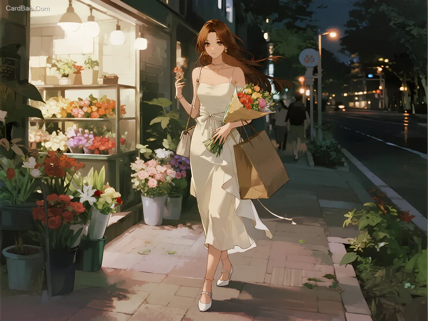 插画风格,线条细腻流畅,色彩柔和,营造出专业且浪漫的氛围,港风,柔和,整体氛围轻松愉快且温馨 半真实风格,人物渲染立体,一位女子,身体修长,凹凸有致,棕色长发,御姐脸,妆容精致,手捧一束鲜花,带有包装纸,走在一个林荫小道里,身后是一家特别好看的花店,细节清晰,人物高清,时尚都市风格,一位26岁女生,身体修长,凹凸有致,高挑温柔气质 ,穿米白色无袖长裙(不规则层叠设计、侧边系带 ),风格温柔、飘逸、仙女风风格简约、时尚、个性,女生背着单肩时尚包包 走在夜晚的大街上,手拎 一个购物袋 背景夜晚的大街上,灯火通明 路上有绿植 行人 ,白色鞋