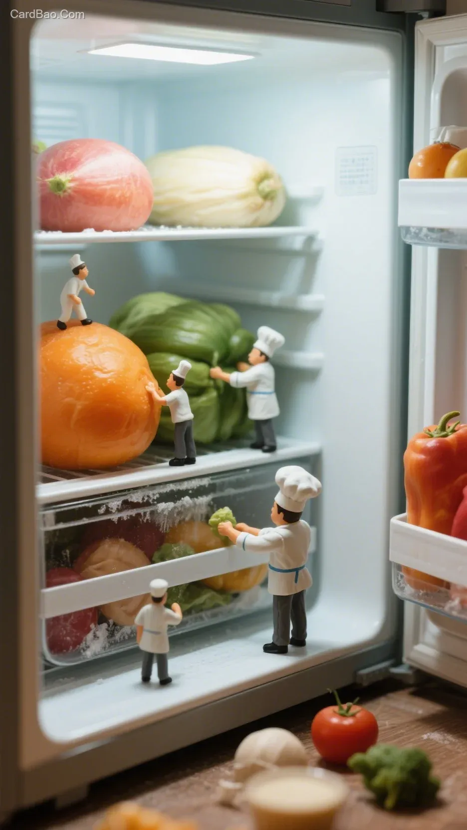 Inside the refrigerator, there is a tiny kingdom where little people are working to preserve and freeze the food. The food is much larger than the people, and you can add chef hats to them.