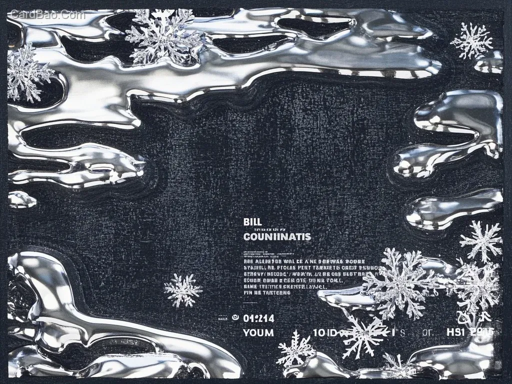 Retro film grain, liquid silver metal, iridescent silver sheen, irregular liquid shapes distributed around the edges, metallic silver snowflakes, perfectly centered horizontal and vertical alignment, creative artwork, glowing metallic texture, chromatic aberration, pure black film grain noise background, minimalist style, movie poster, poster design, color dispersion, glitch effects, typographic movie information layout at the bottom.