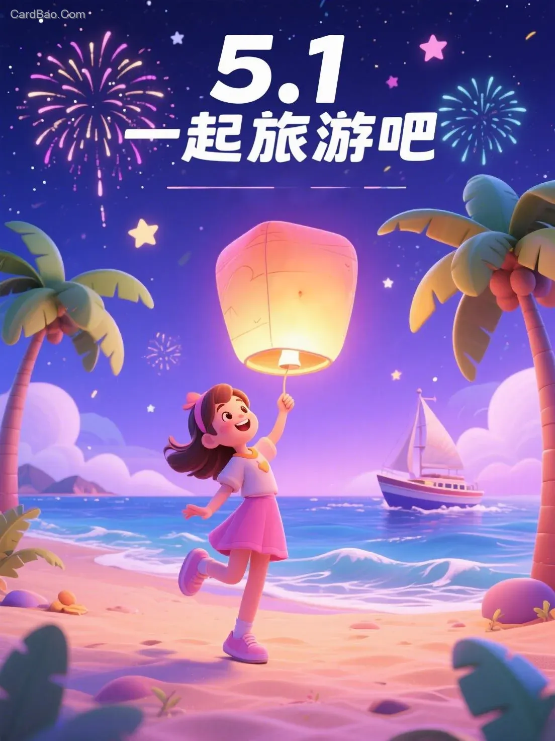 海报设计,旅游宣传插画,充满了活力活泼的氛围,五一出行海报设计,主标题“5.1”位于画面上方,副标题“一起旅游吧”,整体夏日出行风格,旅游元素,高端大气的感觉,构图清晰完整,3d,blender 渲染,2k 画质