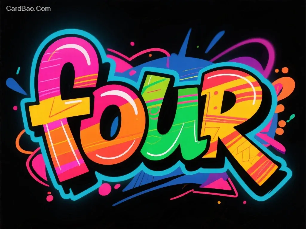 Graffiti-style lettering for "four" with vibrant colors, featuring high-contrast combinations of warm and cool tones alongside neon color collages, creating a strong visual impact overall.