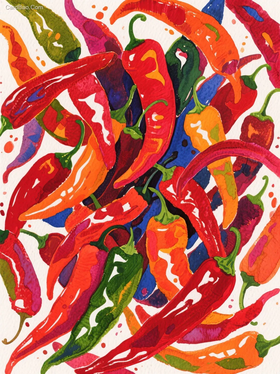水彩画,抽象艺术,插画风格,好多辣椒,厚涂,重彩,颜色对比度高,视觉艺术,视觉冲击力,张力,高饱和度,高对比度