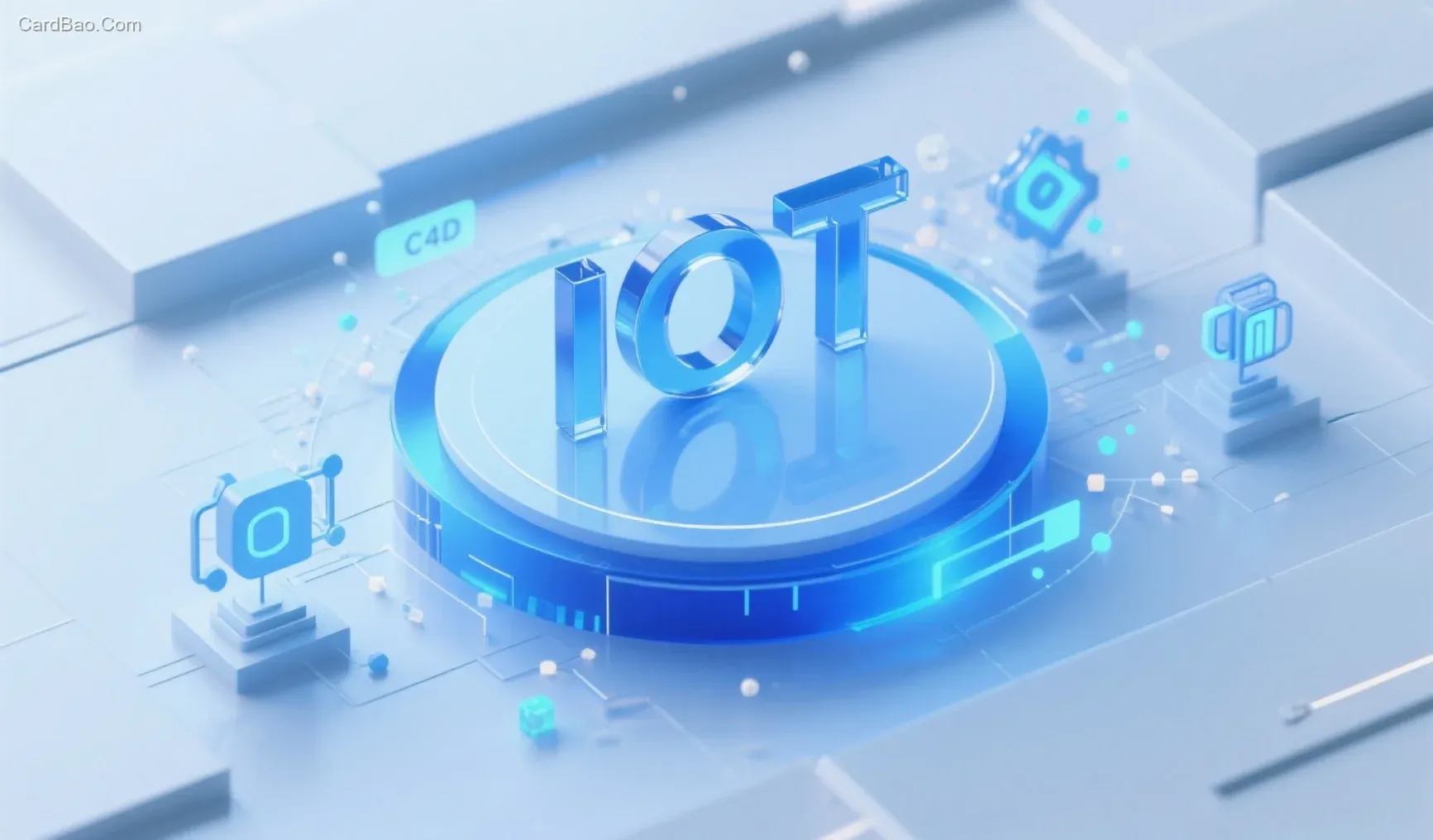物联网会议主KV设计,主色科技蓝色,背景有物联网元素,科技感的粒子光效融合效果,带有互补色极简主义设计。主题文字:IOT,文字玻璃质感,C4D,OC渲染器渲染,资深设计师构图,大师级的设计,简单大气上档次,8K