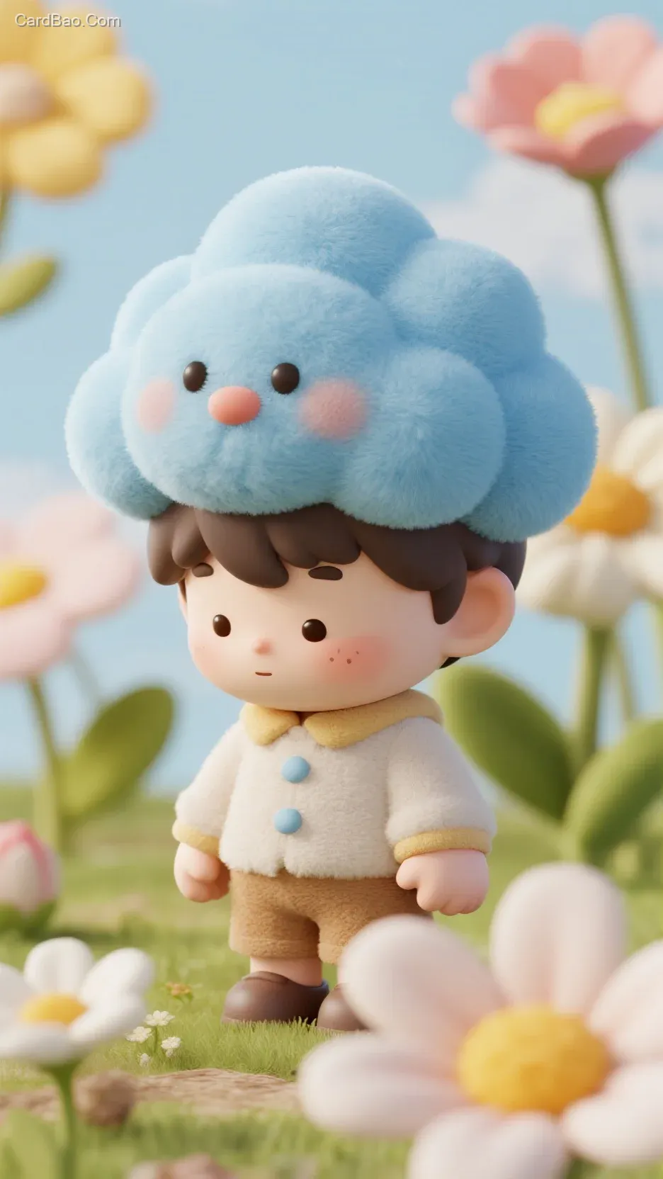 Clairy Laurence,可爱,呆萌,毛绒手办,隐喻,花朵,男孩,与云朵的形体合三为一,云朵似乎在风中漫步。纯真,幻想。艺术感,获奖作品,