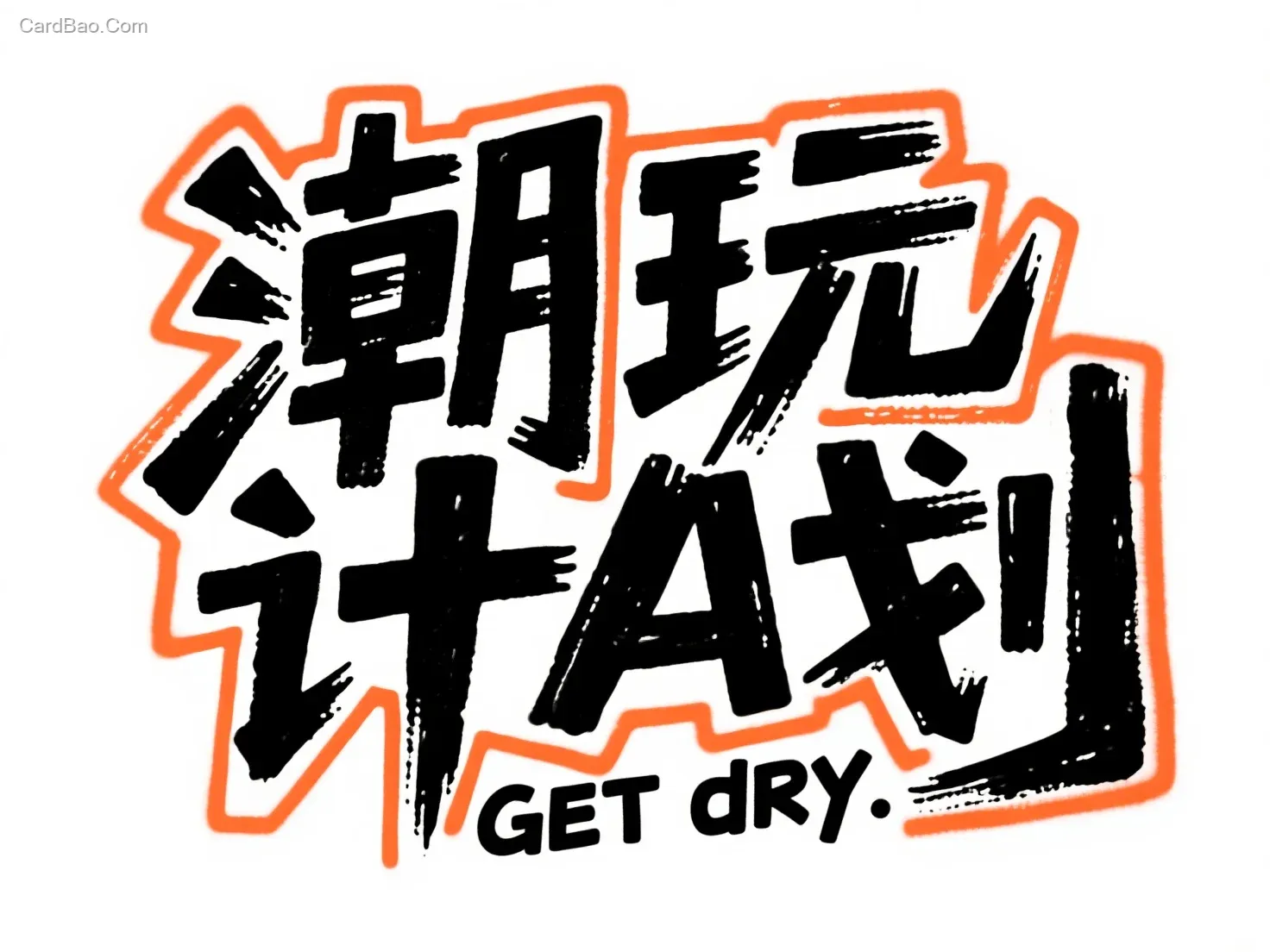 字:潮玩计划。笔画粗粝,带手写涂鸦的不规则边缘、动态张力,模仿街头喷漆效果;字形打破规整,偏旁部首做错位、夸张变形,传递自由叛逆感;配色用黑白主色 + 高饱和单色外轮廓(如橙色、荧光色 ),强化撞色冲击;英文副标(Get dry)用黑体变形,风格与中文统一,适配潮流活动、年轻品牌等场景,营造街头玩趣氛围。高清画质,纯白背景