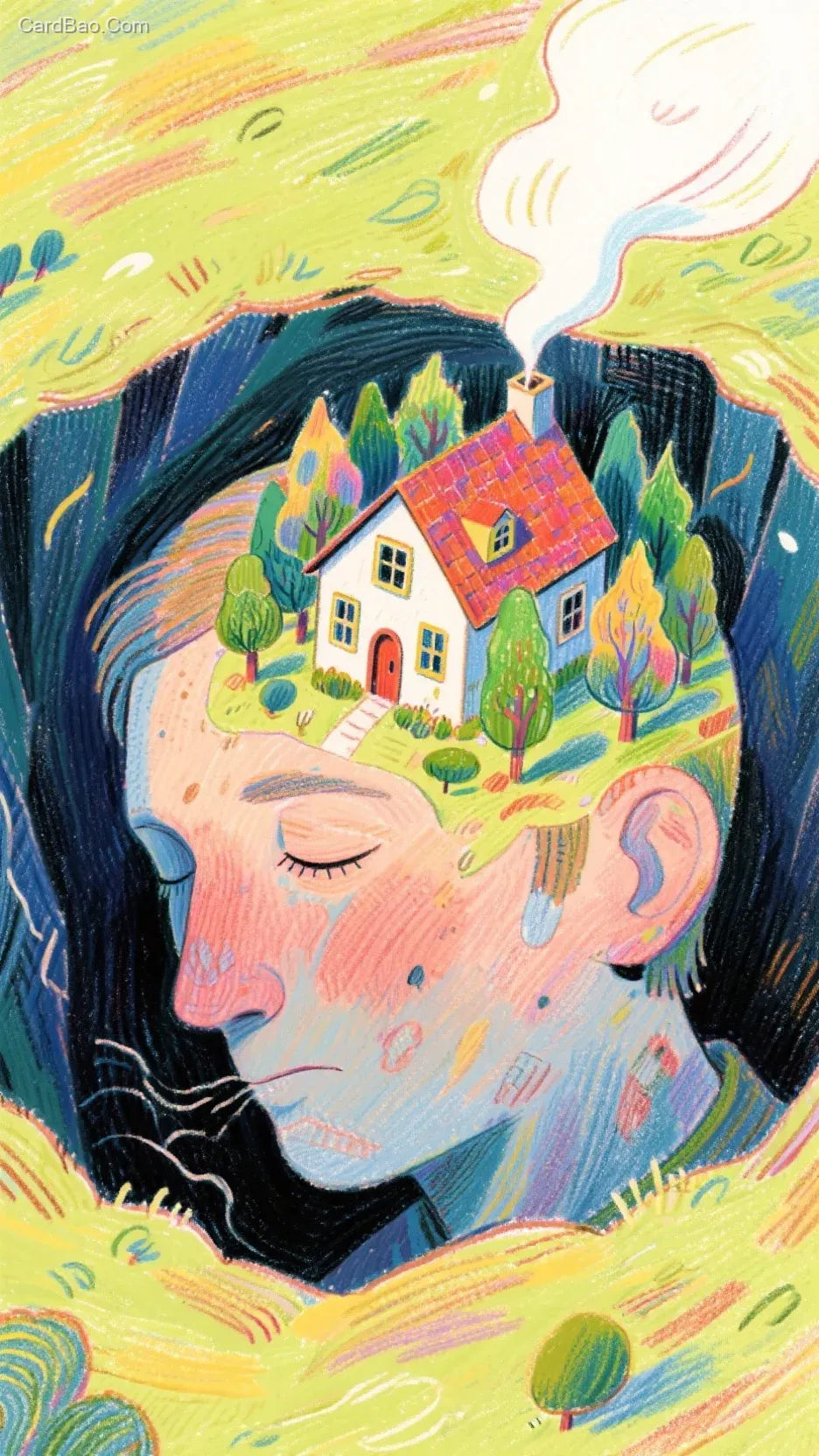 高空俯视角,一座微型房屋生长在沉睡巨人巨大脑袋凹陷的坑里,他的呼吸中绽放出树木。采用**马克·布塔旺(Marc Boutavant)**生动的彩色铅笔手工阴影技法绘制,将奇趣温暖与细腻的情感叙事相融合,呈现出清晰的手绘笔触肌理。这是一幅手绘插画,具有高饱和度、符号化的插画风格,融合了沃尔特·克兰(Walter Crane)、莱奥内托·卡皮耶洛(Leonetto Cappiello)、查理·哈珀(Charley Harper)、爱德华·鲍登(Edward Bawden)、凯·尼尔森(Kay Nielsen)的风格,以及梵高厚涂风、欧普艺术(OP Art)和脏卡通(Dirty Cartoon)元素。