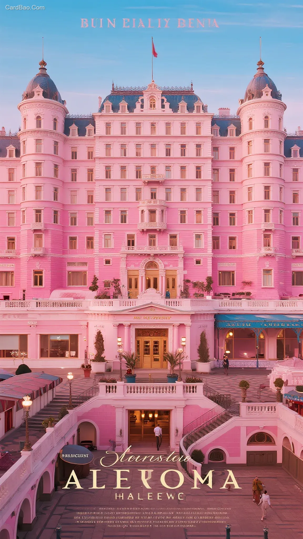 Photography, hyper-realistic, movie cover, The Grand Budapest Hotel, hotel scene, art, high-end pink color palette, ultra HD, 4K, ultimate quality