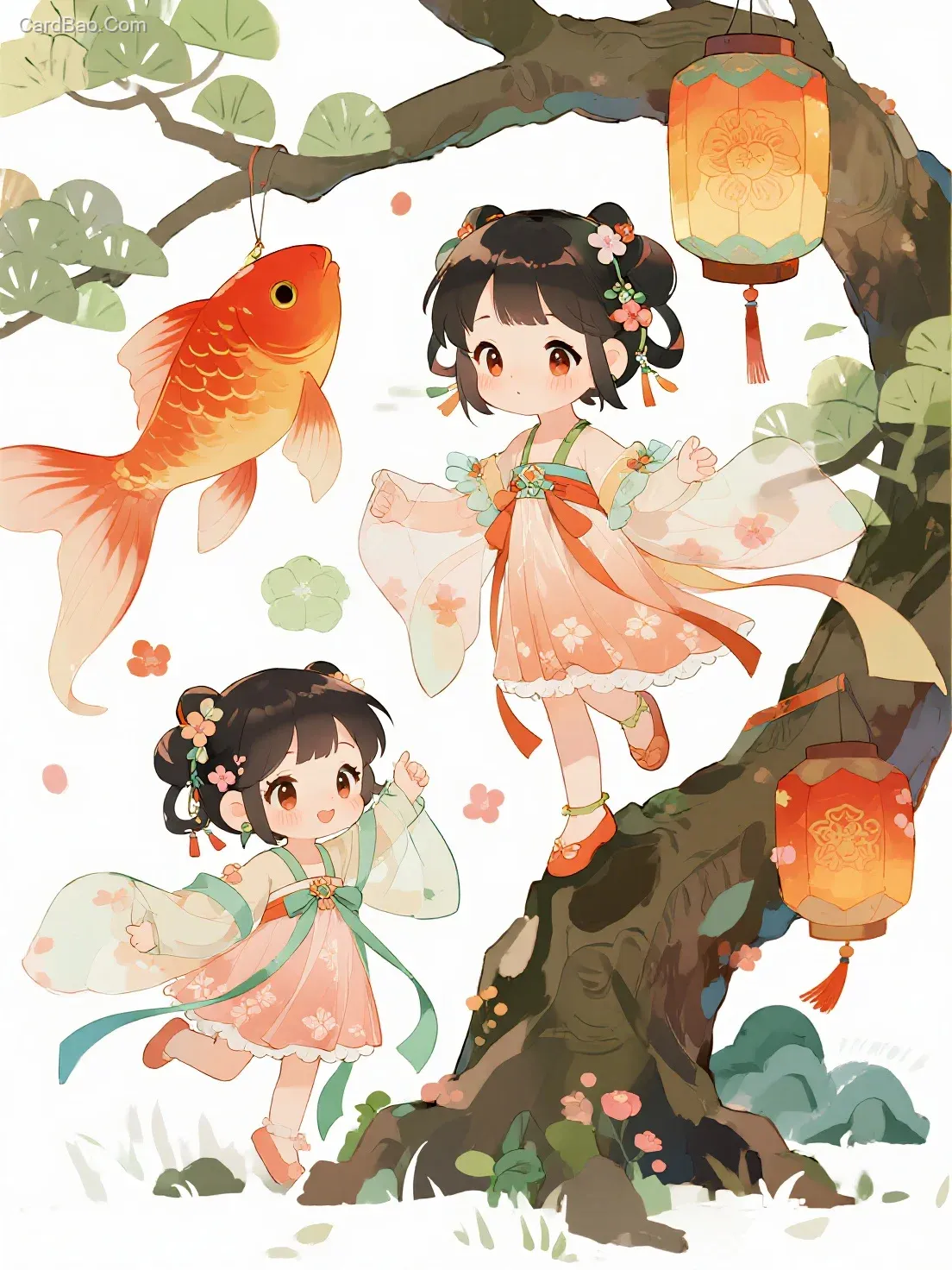 Style: Chibi-style 2D anime with Chinese aesthetic, blank background. Simplified content. Focus on cuteness. A beautiful girl looking at a nearby tree with koi fish lanterns hanging from it. She wears a gauze dress with lace sleeves, floral decorations, and dynamic poses. Strong hand-drawn feel with visible brush strokes. Generate two illustrations in one layout, sticker-style.