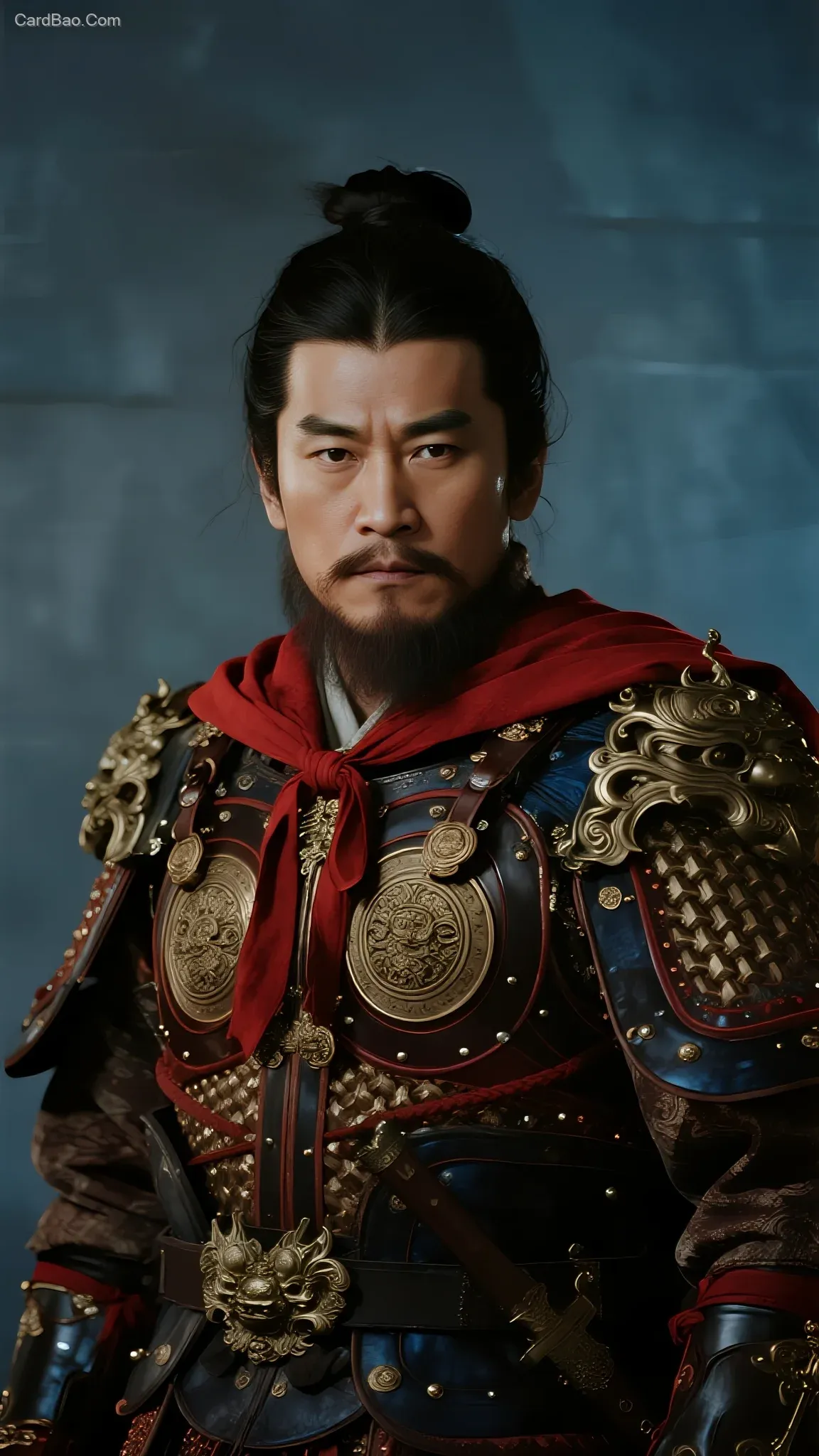 人物特写,岳飞岳武穆,正面照,身着大宋代元帅明光甲,红色披风,面部轮廓刚毅,浓眉大眼,眼神坚定且充满正气,留着胡须,证件照,背景青灰色,历史人物画像,严肃庄重,写实风格,高精度,还原历史,4K超高清,使用柔光箱与环形补光组合,高显色指数LED光源在铠甲表面形成金属高光渐变,暗部保留皮革纹理细节,采用f/8光圈保证盔甲细节全清晰,ISO100控制噪点,伦勃朗布光法突出面部立体感,使用中灰渐变滤镜平衡铠甲反光,后期Dodge&Burn强化山文甲片层次,RAW格式保留锦袍深青色与金铜色色阶