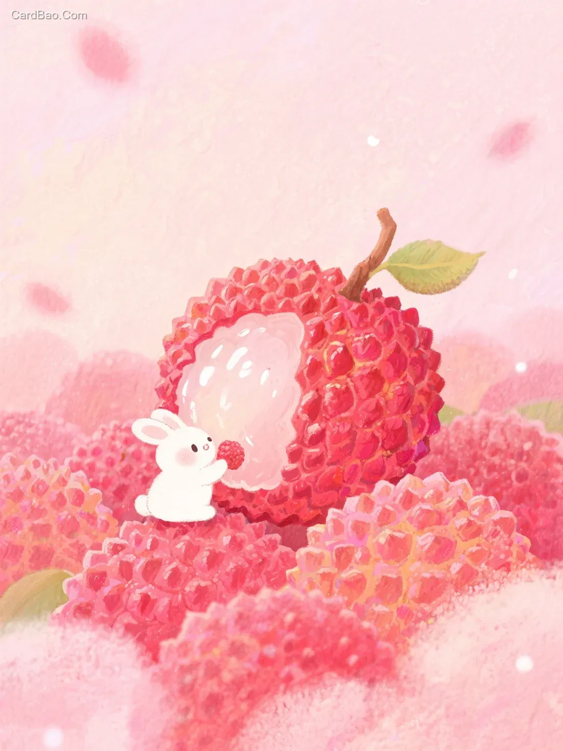 梦幻,治愈,宁静,梦境,颗粒感,萌,肌理感,水粉,手绘,又大又红的荔枝,荔枝饱满多汁,十分诱人,覆盖整个画面,有很小的小白兔吃荔枝,治愈