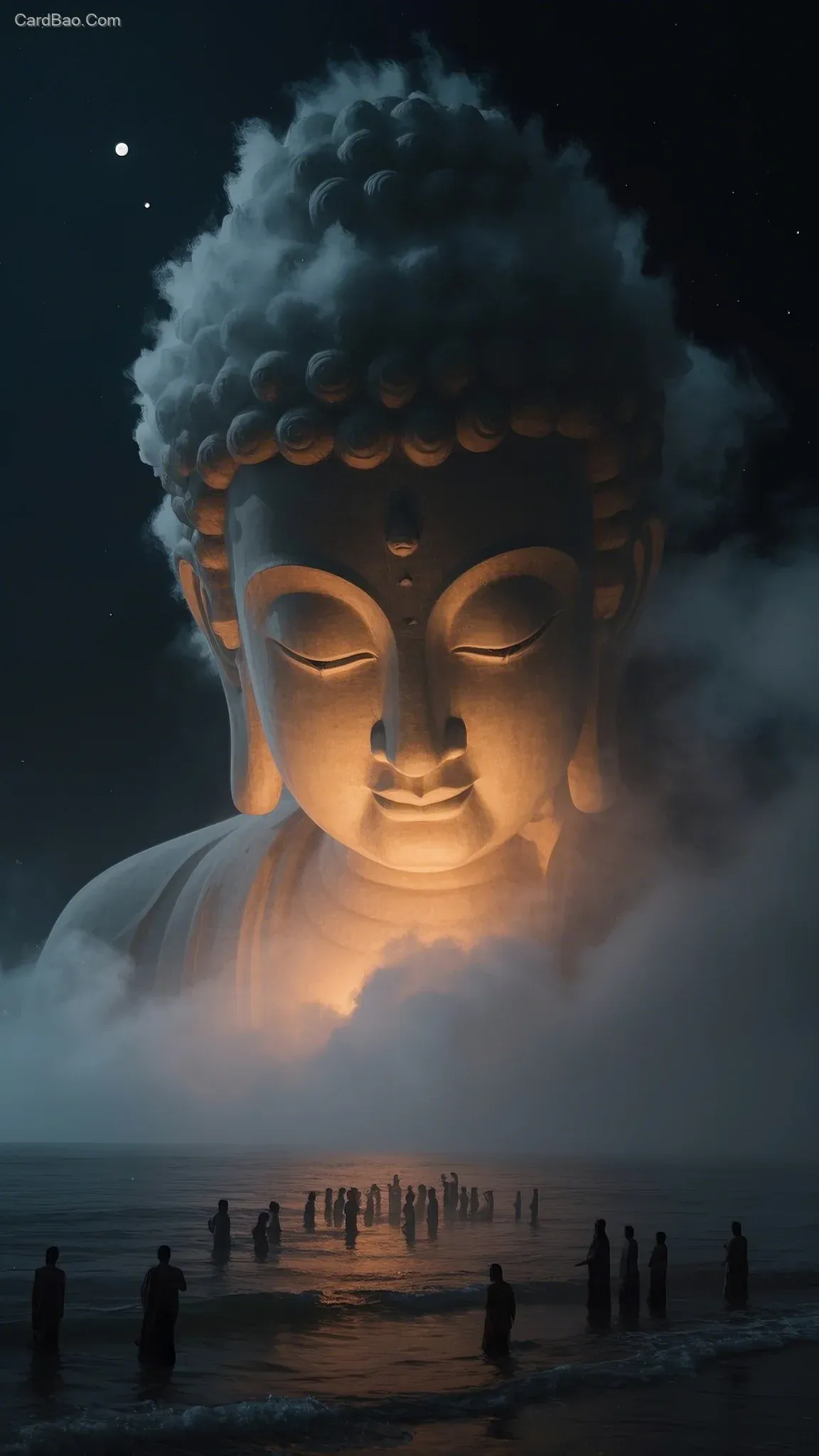 A massive, dark-themed full-body silhouette of the Buddha formed by swirling clouds, set against a nighttime backdrop. Warm-toned lighting softly illuminates the Buddha's face, evoking a sense of both awe and terror due to its colossal scale. The Buddha's eyes are gently closed, exuding benevolence, with abstract facial features, hair, and body seamlessly blending into the misty clouds. His head is slightly bowed, gazing downward as if observing the tiny, insignificant beings below. The background features a vast, fog-covered ocean, creating a dreamy and surreal atmosphere. Shot with a wide-angle lens from a ground perspective, the image is presented in stunning 16K resolution, delivering a cinematic and hyper-realistic visual impact.