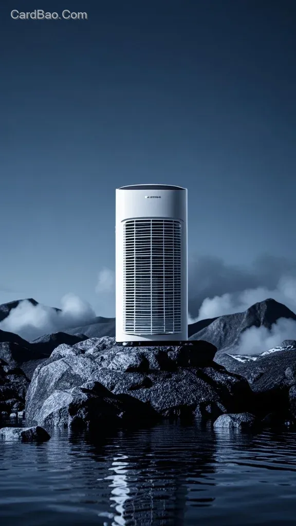 E-commerce Scene Setup C4D Dark Sky Close-up Water Surface A White Tower Air Cooler Placed on Black Rocks in the Water Perfect Composition HD Image