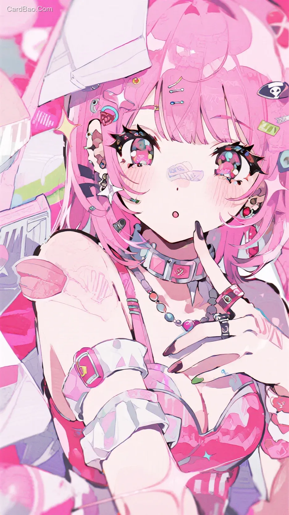 波普艺术,梦幻色彩,梦幻感,夸张,脸部近景,二次元少女,扁平插画,弥散渐变,颗粒感,模糊效果,层次感,多重构图,复杂构图,喻性关联,y2k,多维度意识空间,时光机,意识流,画面与人物交融交织,空间扭曲,景深,大场景,油画重彩,色彩饱满,色彩晕染,笔触细腻,赛璐璐风格,二次元,动漫,复古漫画,正面脸部特写,详细的脸,身上点缀着各种配饰,背景充满日本亚文化元素,整体呈现朋克风格,平涂画法,粉色和白色调,日本漫画。油画重彩,色彩饱满,色彩晕染,笔触细腻,水墨渲染,唯美,近景