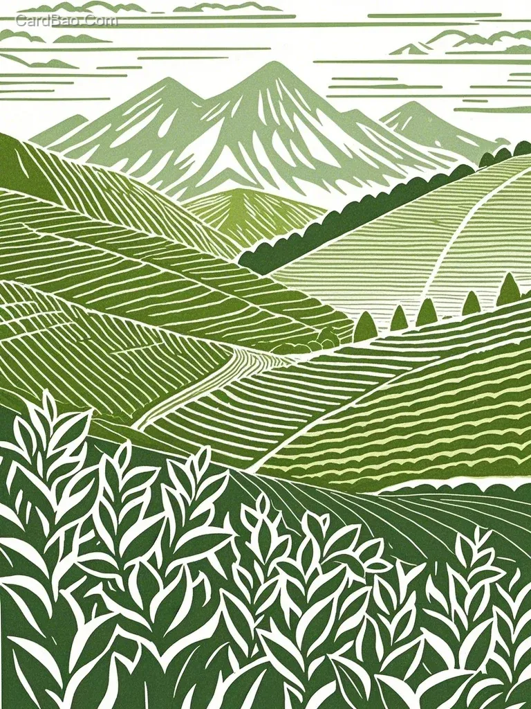 矢量画,茶园、群山,复古肌理线条,木版画,白色背景,插画,扁平画,细节丰富,线条清晰优美流畅,富有艺术肌理感