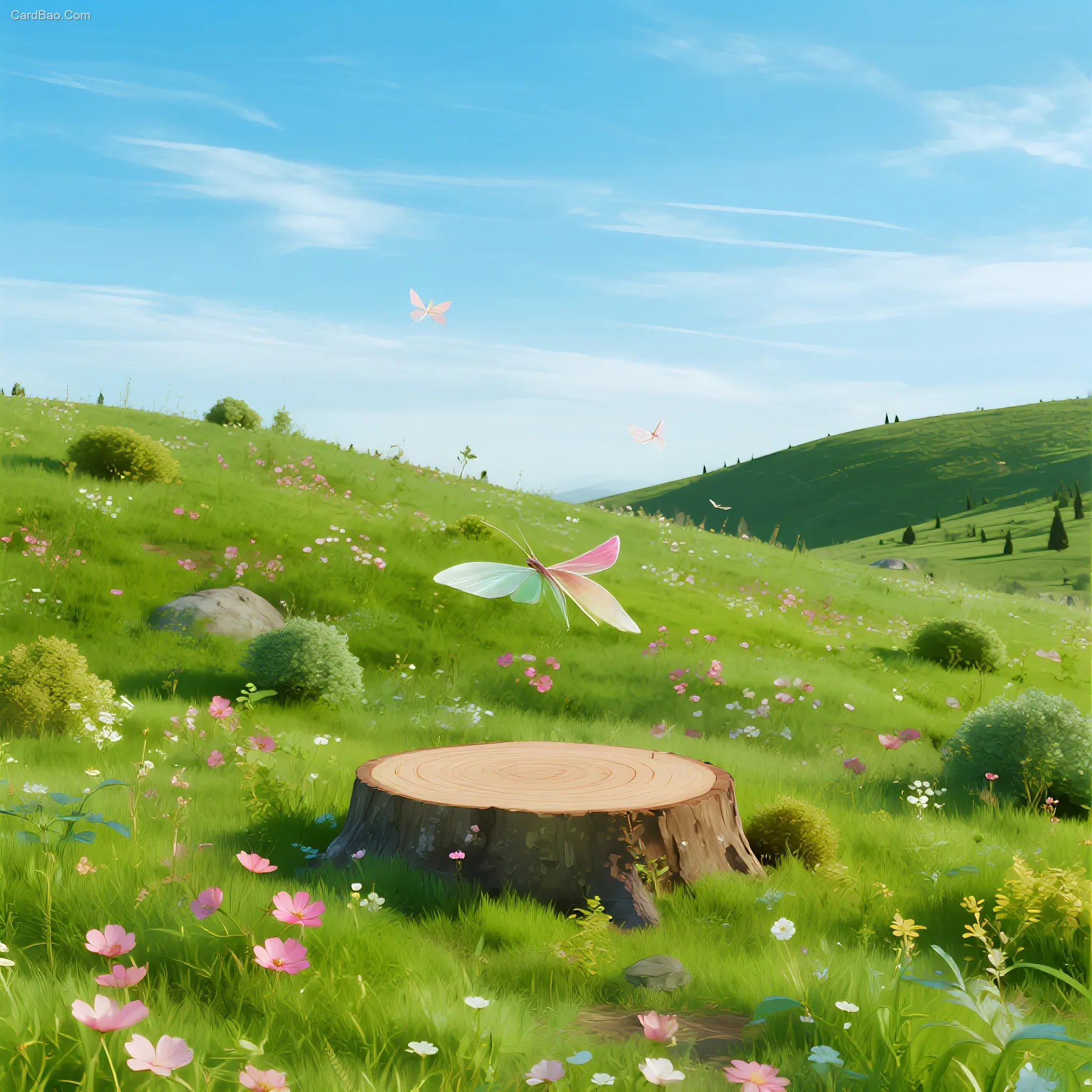 一片广阔的绿色山丘,覆盖着茂密的青草,点缀着粉色和白色的小花,以及少量稀疏的浅绿色灌木。有一块圆形木头展台。