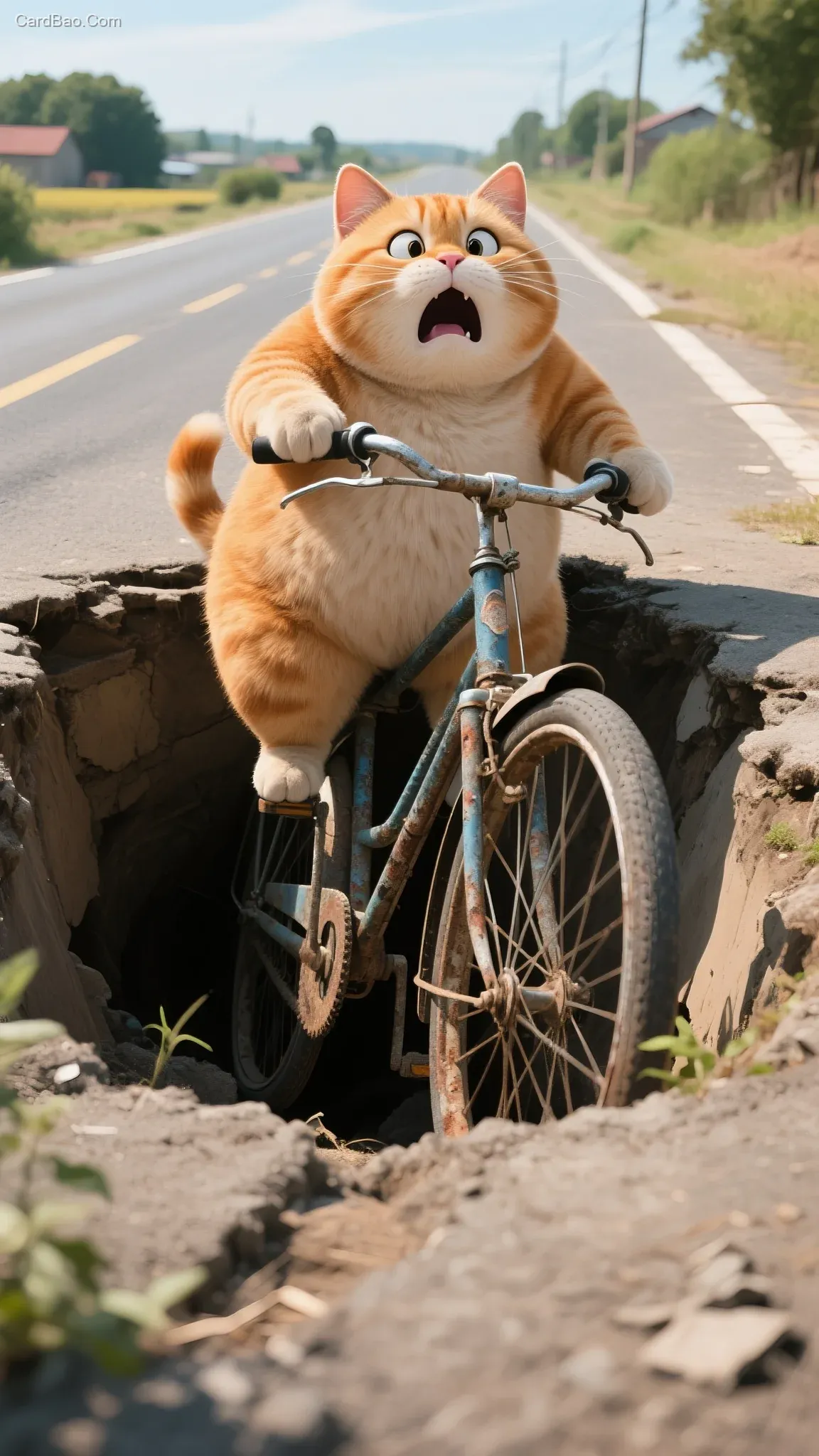 写实风格 真实场景 一只拟人化圆润的胖橘猫满脸惊恐骑着破旧的二八大杠掉进大坑里在农村的公路上 阳光明媚
