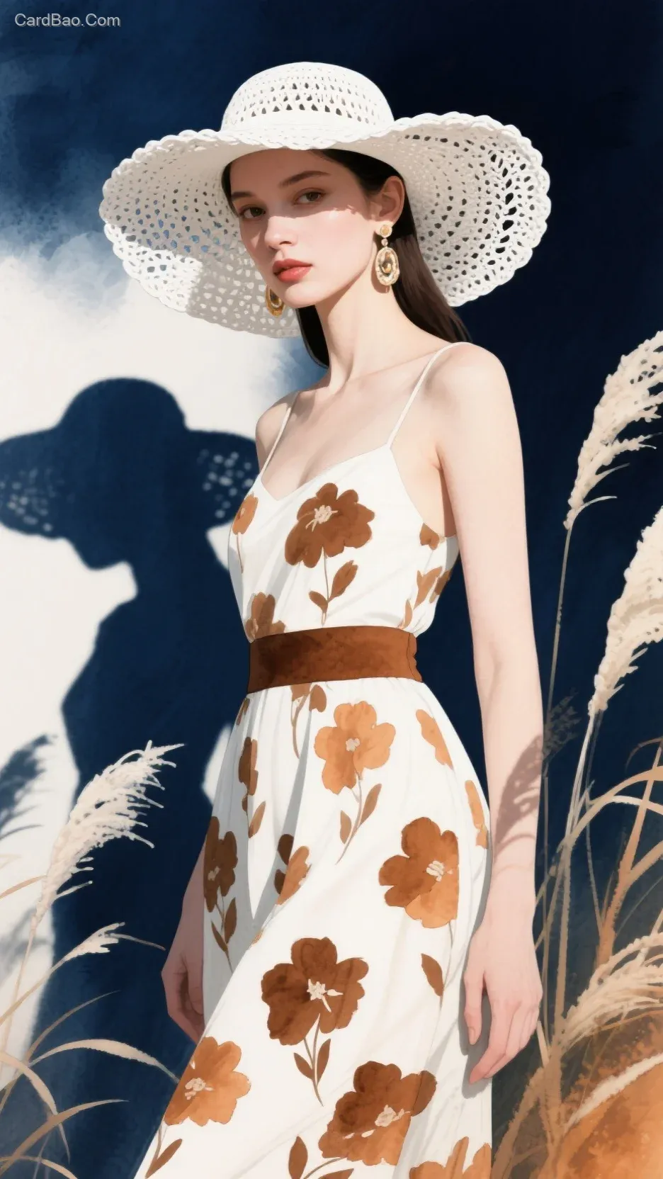 一位带耳环穿休闲高定白底棕色花宽带裙的时尚模特,戴白色高定设计款钩花编织大沿渔夫帽,身姿高挑丰满且婀娜,芦苇背景简洁深邃,有模特影子叠加,水墨画水彩晕染插画风格,多角度拍摄,艺术感、设计感,凸显强烈设计感和层次感,普鲁士蓝与琥珀色基调,明暗对比、光影交错