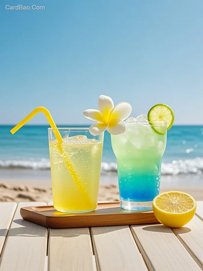超写实海滨饮品场景,前景是浅色木质台面上,左侧放着一杯黄色气泡饮,透明玻璃杯里满是碎冰,插着一根黄色弯吸管,液体表面泛着细密气泡。右侧是一杯分层渐变的蓝绿色冰饮,杯口露出一片柠檬角。两杯饮品间有一朵白色带黄色花心的鸡蛋花。背景是晴朗蓝天与渐变蓝绿色大海,海浪轻拍沙滩,整体色调明亮清新,营造夏日海滨悠闲惬意氛围
