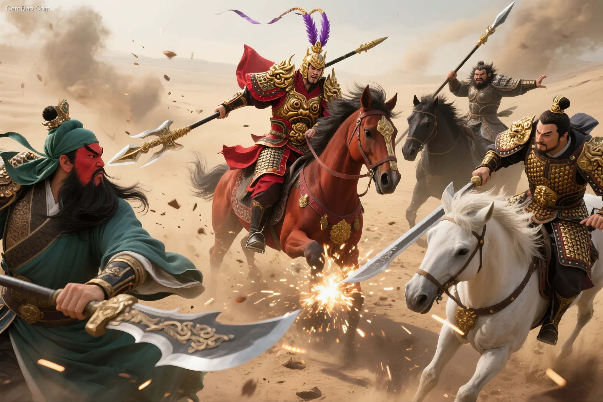 4位三国演义人物(3个打1个),兵器交击处迸射火花。(画面中间是吕布,身披金红交织的饕餮兽面铠,头戴雉翎紫金冠,手持方天画戟,骑着赤马,怒吼回过身厮杀);(左侧关羽,红脸黑眉,黑色长髯及胸,头戴青巾配金属发冠,身穿青袍,手握青龙偃月刀,骑赤马);(右侧张飞,穿豹头环眼盔甲,持丈八长矛,骑黑马);(右侧刘备,持剑,穿鎏金锁子甲配金属发冠,骑白马)。背景中飞沙走石,硝烟弥漫。锐利焦点,8k分辨率,电影级光照,虚幻引擎5渲染,俯视全景镜头。