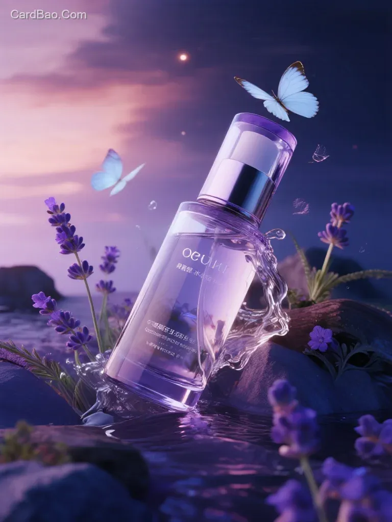 一幅高分辨率的 3D 渲染图,画面中央是一瓶保湿水。瓶体透明,内部是透明的液体。背景是梦幻的仲夏夜场景,天空呈现出深紫色与柔和粉色的渐变。瓶身周围有精致的薰衣草花和其他紫色调植物,水流,还有几只飞舞的蝴蝶。柔和的环境光营造出神奇而浪漫的氛围。超细节,8K 画质,在 ArtStation 上流行。