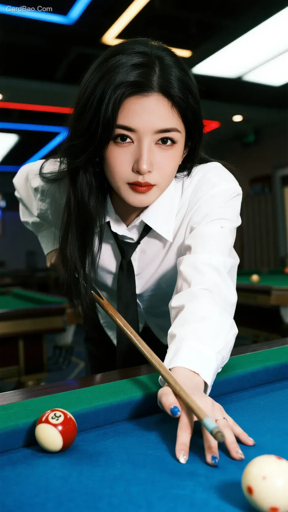 ##专业摄影棚肖像,年轻亚裔女性,紧握台球杆,低角度俯身瞄准蓝绿丝绒桌面八号球,眼神锐利专注,白色丝质衬衫配黑色窄领带,披肩乌黑秀发垂落。动态光影塑造立体感,聚光灯下汗水微珠清晰可见。深焦背景虚化霓虹灯牌,仅留精致球桌轮廓。柔光捕捉肌肤质感,红唇、蓝球、绿桌形成撞色美学。顶级细节,8K 电影质感,运动张力迸发,青春荷尔蒙气息。ar 16:9 ,台球 ,人像摄影 ,运动美学 ,色彩冲击 ,即梦精选