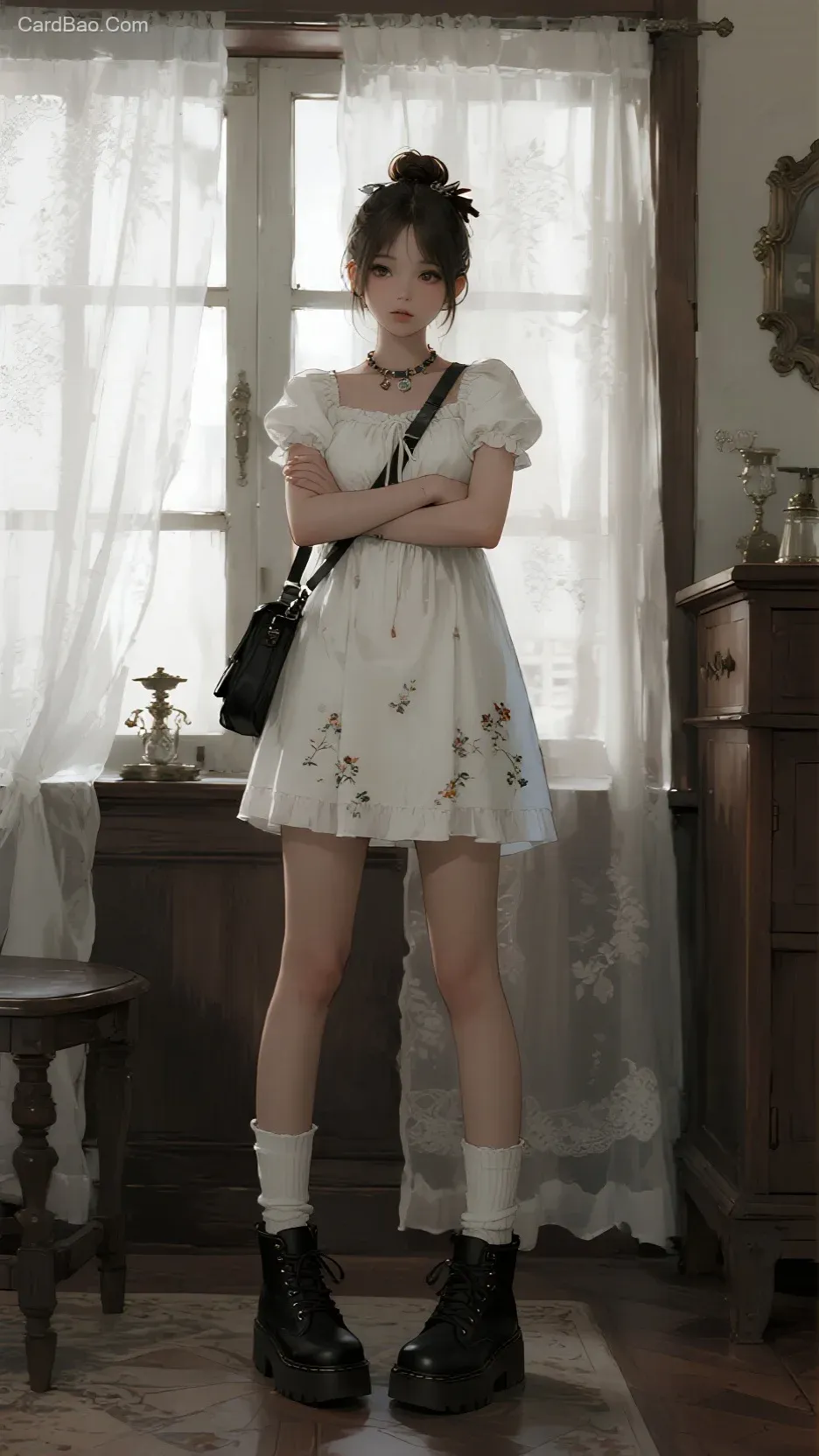 In a retro and elegant indoor setting, white sheer curtains, wooden furniture, and metallic accents blend together, exuding a literary and classical ambiance. The character sports a playful bun hairstyle and a fresh outfit—a white embroidered dress made of lightweight cotton fabric with sweet puff sleeves, paired with soft white mid-calf cotton socks and chunky black platform Dr. Martens boots, merging edgy coolness with delicate charm. A simple black crossbody bag and delicate hair accessories and a necklace add refined touches.