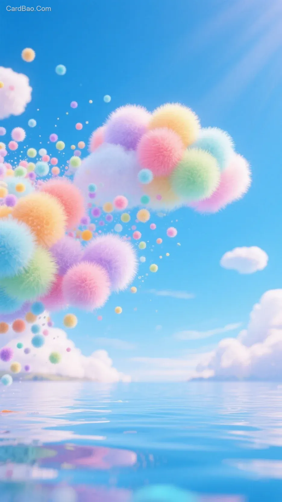 假如风由不同颜色的无数质感粒子组成。C4D,毛绒质感的可爱风景,蓝色清澈的水面,大面积留白,磨砂质感,超现实主义拍摄,多巴胺色调,毛茸茸的微观世界化作了梦核的仙境。光线在绒毛间轻盈跳跃,每一刻的定格都像是在捕捉一个温柔且神秘的瞬间,引领观者进入一个充满想象的天地。蓝色的天空背景,五彩斑斓的云朵,超近景,高饱和,马卡龙配色,超现实主义,像棉花糖一样,柔软,有弹性一