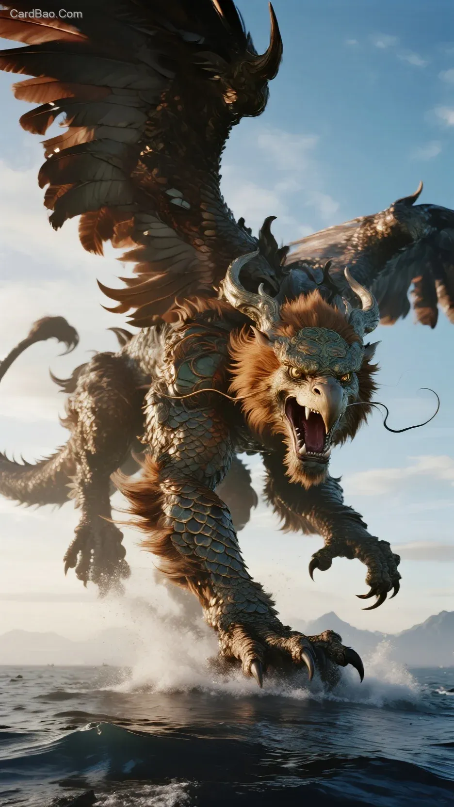 一只庞然上古巨兽,望其身躯一眼,便会产生一种巨大压迫感,整体形象霸气无比,其庞大的身躯给人窒息之感,威压十足,巨大翼翅张开,便能覆盖整座大山,整个画面宏大,更加添加巨兽身型,深渊巨口张开变能吞噬一片大地,其飞翔与海面之上,咆哮而出,震撼拉满,鹰头,狮子毛发 头部都是鳞甲,山海经,异兽,奇特,颜色重组,电影质感,虚幻引擎,高级打光,折射,光晕,金属,大师构图,广角全景,巨物恐惧症,,细小的鳞片