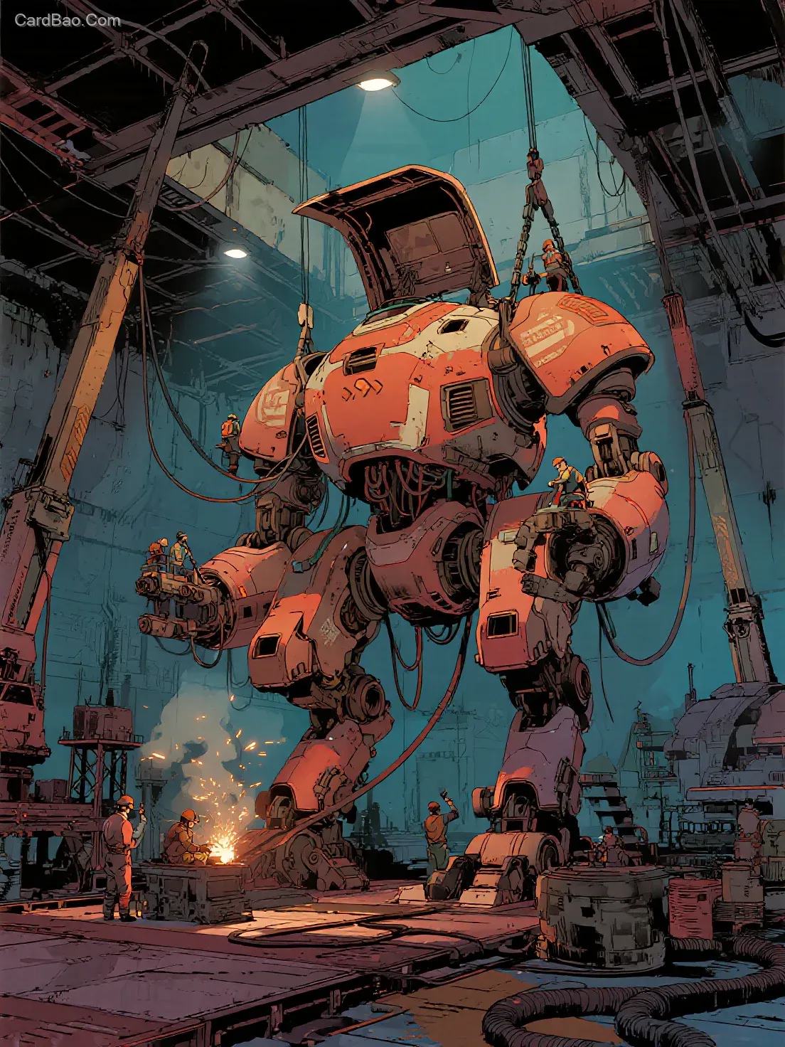 Moebius (Jean Giraud) style, retro Ming Dynasty technology, a fusion of cyberpunk and neo-Chinese aesthetics, maximalist, intricate, underground, giant mecha, exposed wiring on the mecha, mechanical structures, open hatch, spotlights casting faint light on the mecha, mechanics and workers riding on lifts surrounding the mecha from top to bottom, workers welding the mecha with sparks flying. Several massive mechanical arms are transporting various components of the mecha, cables plugged into the mecha transferring energy, focused, low-angle shot, panoramic view.