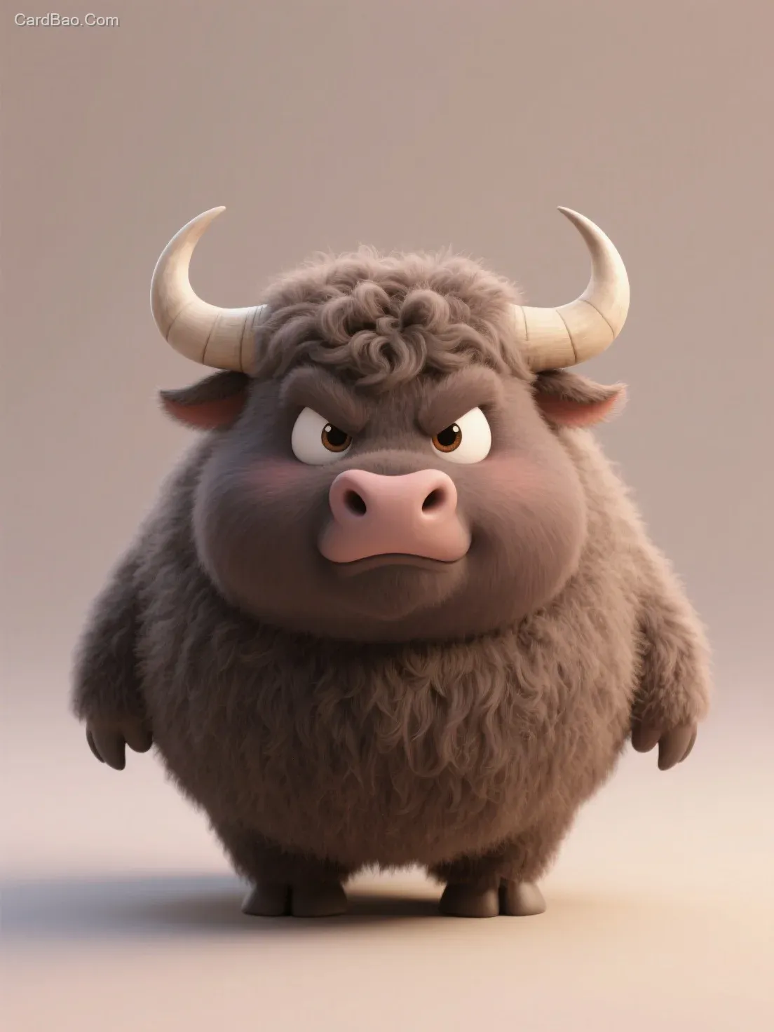 一只胖乎乎的球形身材的呆萌傻气表情的水牛,斗鸡眼,毛绒绒的蓬松质感,3D,C4D渲染,纯色简约背景,极致的清晰度,
