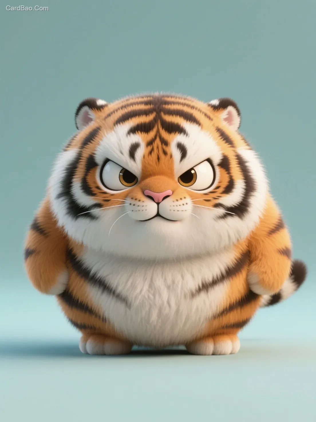 一只胖乎乎的球形身材的呆萌傻气表情的虎,斗鸡眼,毛绒绒的蓬松质感,3D,C4D渲染,纯色简约背景,极致的清晰度,