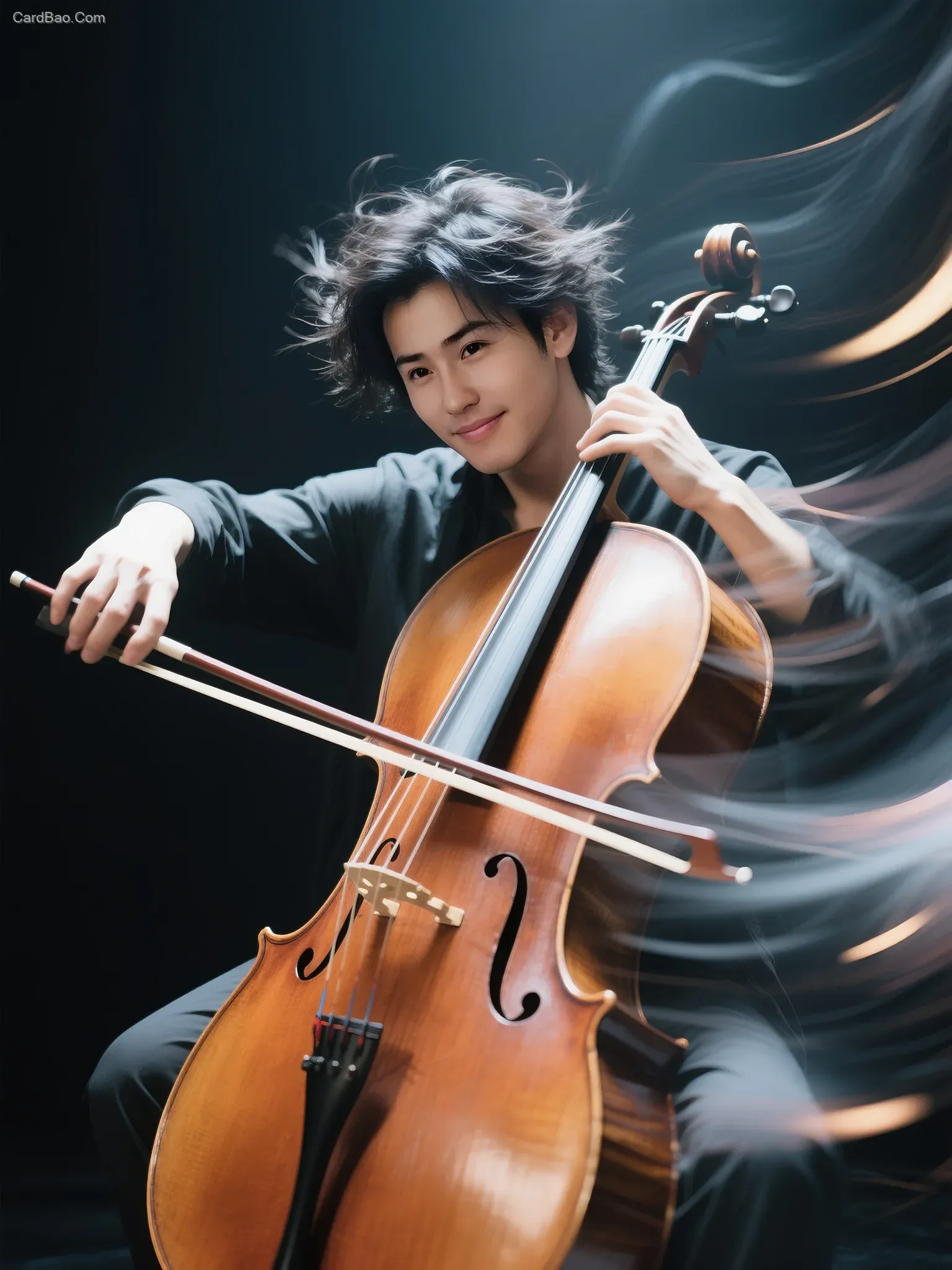 ## Dark tones, glowing haze, disheveled flying hair, abstract, rhapsodic, passionate cello, faded pastel colors, low-light atmosphere, multiple exposures, blended artistic conception, wide-angle, strong perspective, dynamic aesthetics, diffused multi-layered glowing blur, high visual tension, surreal, vivid and flawless details, award-winning masterpiece