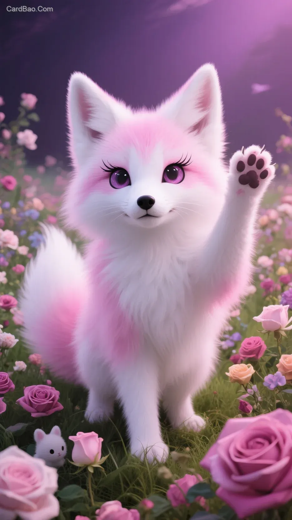 一只超级可爱的白色妖狐,粉色渐变的绒毛,邪魅妖异的眼睛,长长的睫毛,在花团锦簇的草地上 ,有玫瑰。有月季,还有其它小动物, 眼睛大大的萌萌的 ,表情超级可爱, 小爪子高高举起,8k高清。