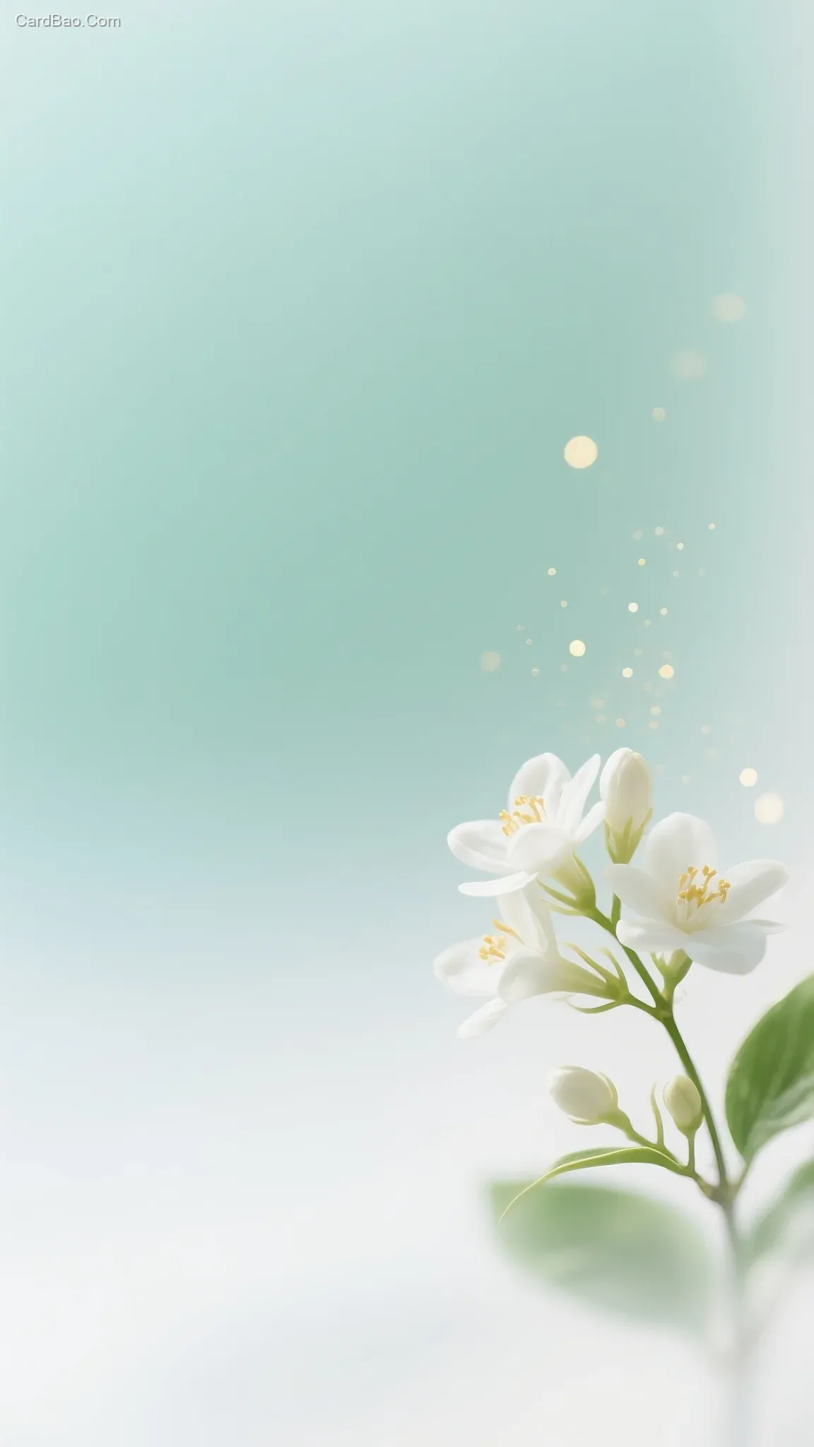 背景浅浅淡淡的薄荷绿与白色渐变,右下角一枝茉莉花,少量金色发光粒子。柔光滤镜毛玻璃质感,冷色调朦胧梦幻感。