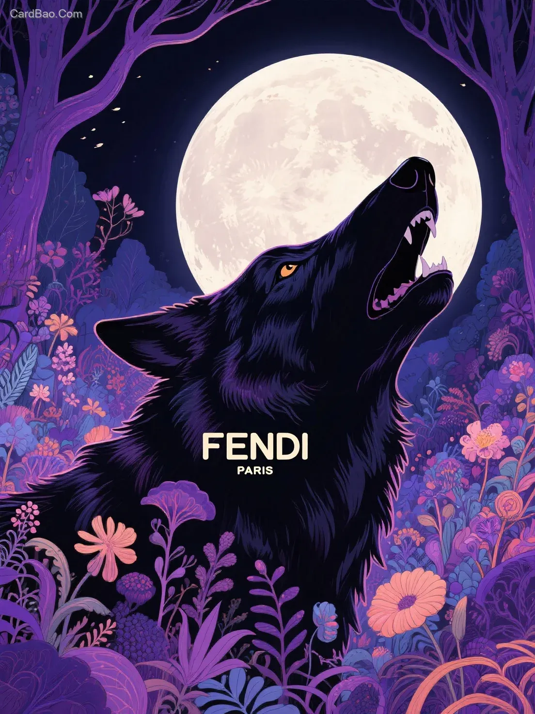 大师杰作,极繁主义,复古插画,时尚插画,fendi插画,巴黎世家插画,北美黑色野狼,面部特写,野狼啸月,静谧夜空,巨大的圆月,午夜紫色的丛林,盛开的奇花异草。梦幻风格,fendi插画,独特的视角,高品质细节,细腻的笔触,创新的撞色技法。治愈系插画,高分辨率,最佳品质,8K壁纸,时尚杂志,潮流海报。
