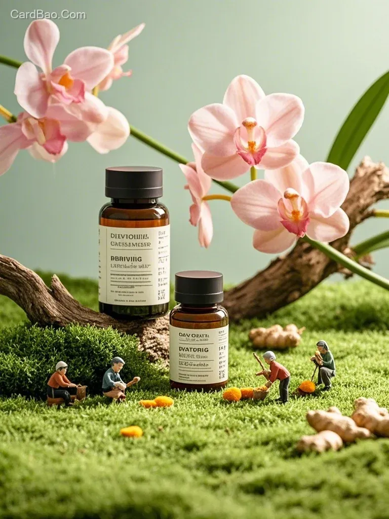 一片翠绿草地中,两个小瓶子一个立于枯树。一个在草地上,有几个泥人人正在采摘姜黄。背后是一片粉色大花蕙兰,柔和阳光洒落,凸显产品,营造出自然与产品清新和谐的融合感。画面为高分辨率,注重细节,呈现出写实且吸引人的产品摄影风格。