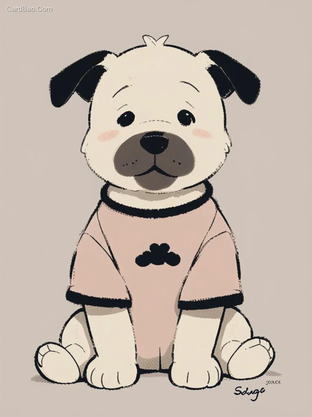 ##衣服改成酒红色,主体为坐姿米黄色小狗,全身以粗黑线勾勒轮廓。面部:圆形脸庞,双眼为两颗小黑点,鼻口部融合成大面积纯黑椭圆,脸颊两侧对称分布浅粉色腮红(边缘柔和自然)。身体:短胖四肢呈坐姿展开,爪子简化为圆形色块,整体线条圆润无棱角。右下角标注手写体签名“sc20”,字体细小且贴近身体右侧边缘。背景为纯固态白色,无任何附加元素,画面风格简约扁平,色彩过渡自然无渐变,保留手绘质感的粗粝笔触边缘。卡通狗狗稍微改变下