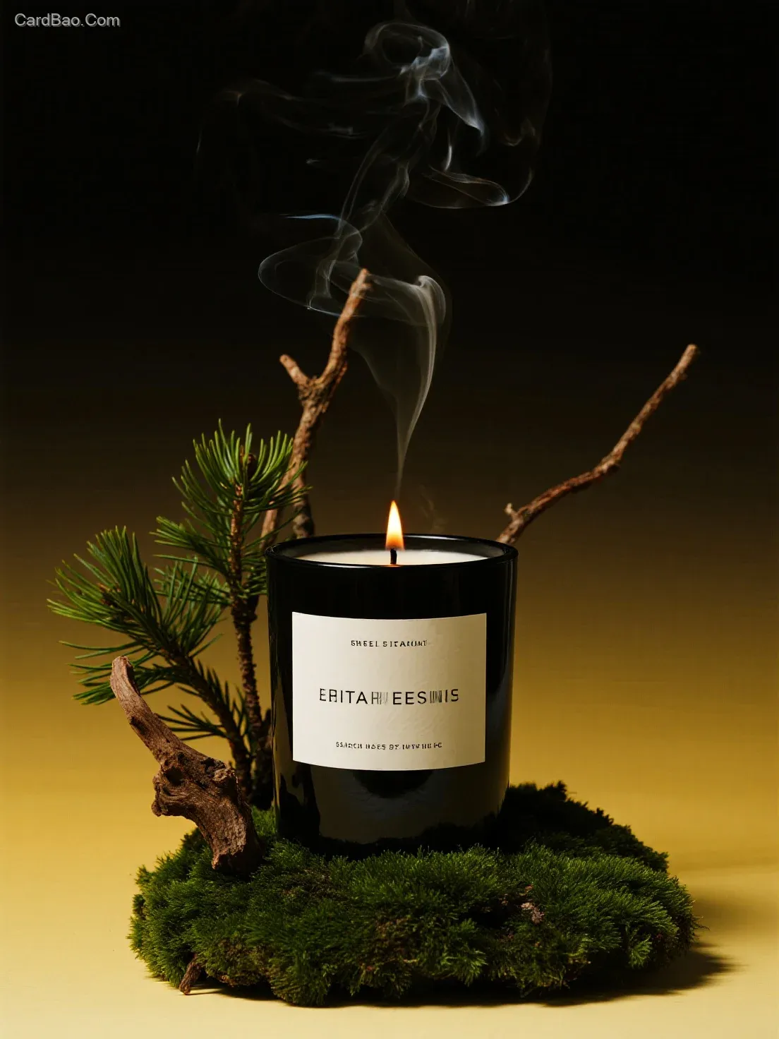 A scented candle surrounded by pine needles and dried wood, with ample negative space, still life photography, commercial photography, elegant and refined, artistic, high-end aesthetic, Chinese aesthetics, minimalist aesthetics, ultra-sharp, best quality, high-definition, with a gradient background transitioning from black at the top to yellow at the bottom.