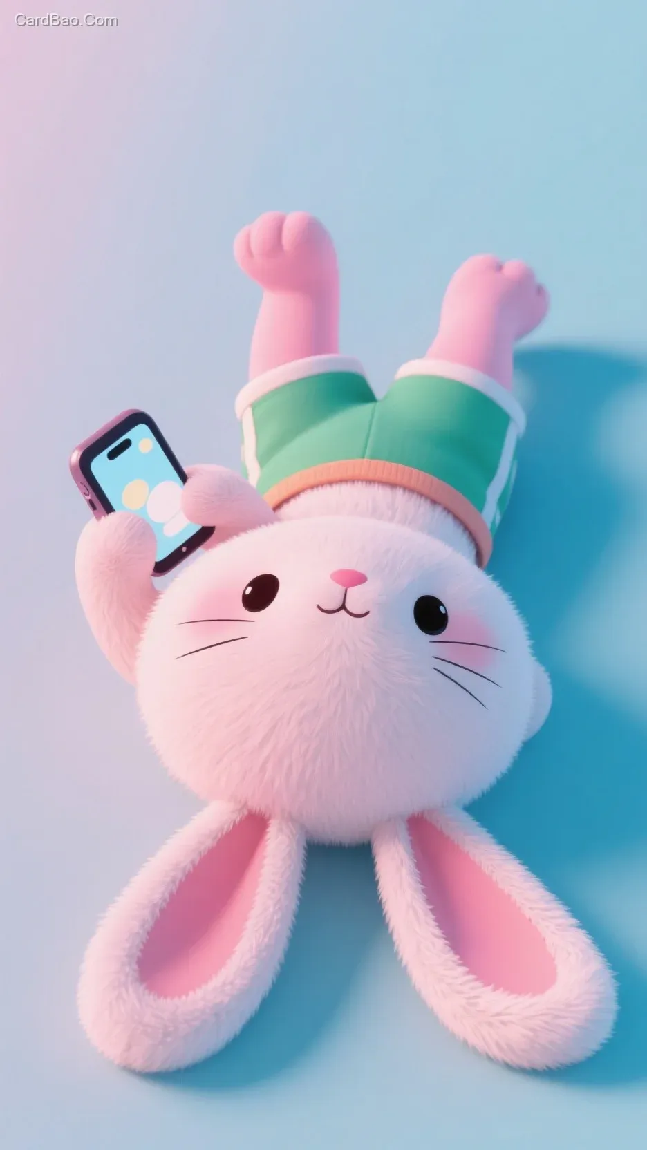 a chibi rabbit laying on it's stomach and texting on a phone with its legs in the air from behind --v 4