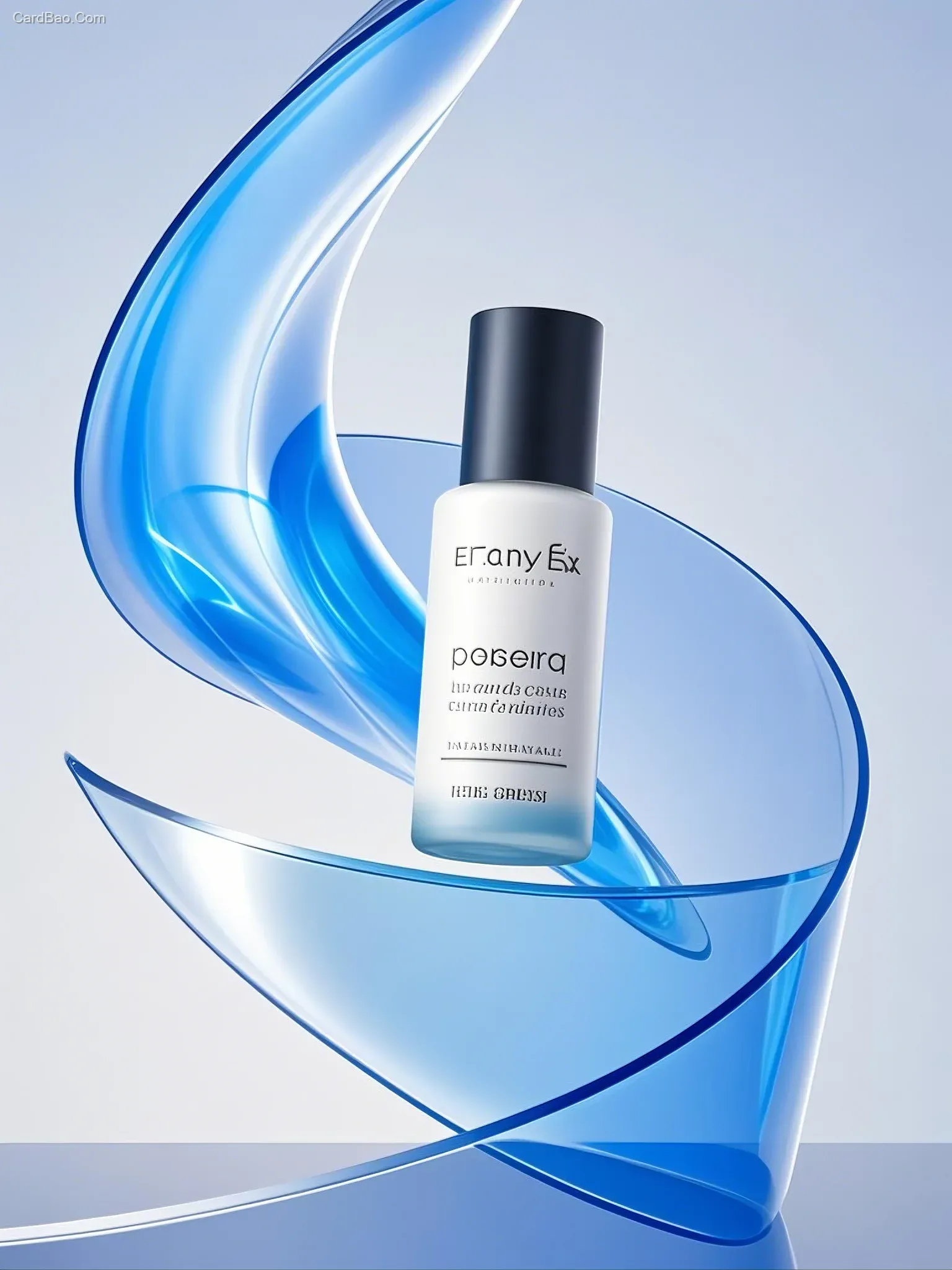 商业渲染,护肤品渲染,一个护肤精华悬浮在空中,周边是螺旋的液态玻璃,双层蓝色白色渐变宽玻璃,玻璃内部有蓝色液体,低饱和度蓝白渐变背景,干净背景,悬浮,大透视,冲击力强,空间感,立体感,科技感,oc渲染,c4d渲染,高清的,8k