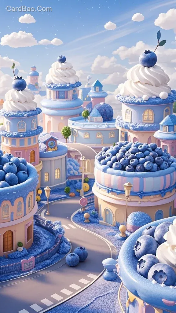 A fantasy city composed of blueberries, where the buildings, streets, and even the ground are made of large, juicy blueberries. The entire urban landscape is vibrant in color, and the air is filled with the sweet fragrance of blueberries. Creamy clouds float in the sky, and some buildings are adorned with whipped cream on their rooftops. The whole scene is brimming with childlike whimsy and fantasy, as if stepping into a sweet fairy-tale world.