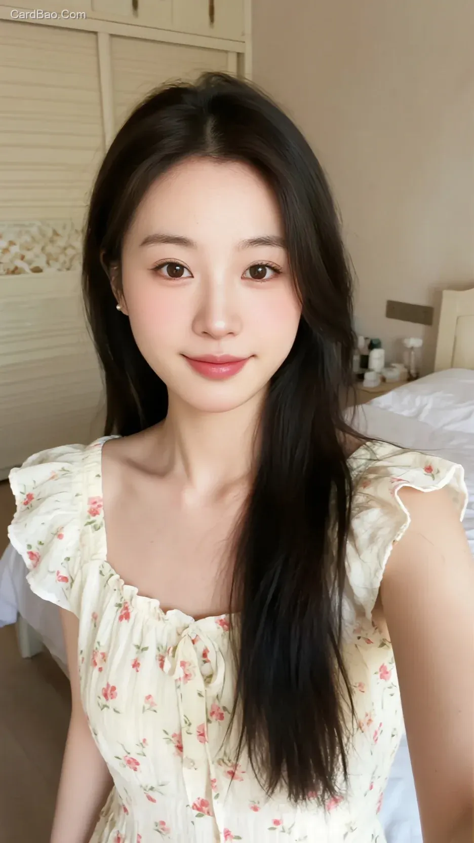 在温馨的室内环境里,一位女子身着带有小花图案、荷叶边装饰的浅色连衣裙,长发自然垂下。背景可见柔和的床铺、简单的家具以及生活小物件,氛围轻松日常,尽显甜美柔和的居家风格 。