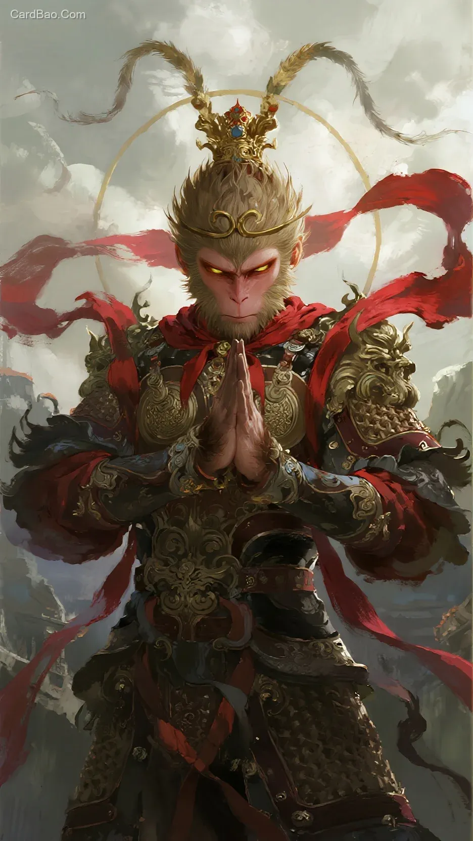 风格为中式怪诞风格。画笔厚涂,低饱和度,笔触纹理清晰,画面通过细腻的笔触和丰富的色彩层次塑造主体与场景,质感逼真,法天象地,斗战胜佛,身穿华丽盔甲,头戴金冠,身后红色披风,法力飘带遮天蔽日,整体兼具艺术感,大透视,底光打在脸上,镜头仰视主体